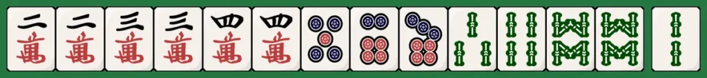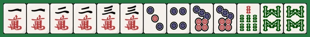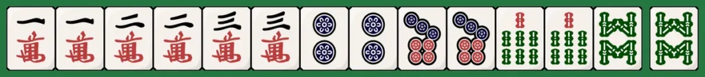 一盃口は、同じ種類・同じ数字の順子を2組作ることで成立する1翻役です。例えば、上記のように1m1m2m2m3m3mといった形で1m2m3mを2組揃える形が代表例です。このとき、順子が完全に同じ並びである必要があります。