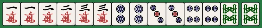 例えば、上記のような一盃口と七対子の二つが揃っているような手牌の場合、一盃口と七対子(チートイツ)とは複合せず、七対子のみと扱われます。七対子は7組の対子のみで構成される特殊系の役であり、順子を2組揃える一盃口とは根本的に構成が異なるためです。