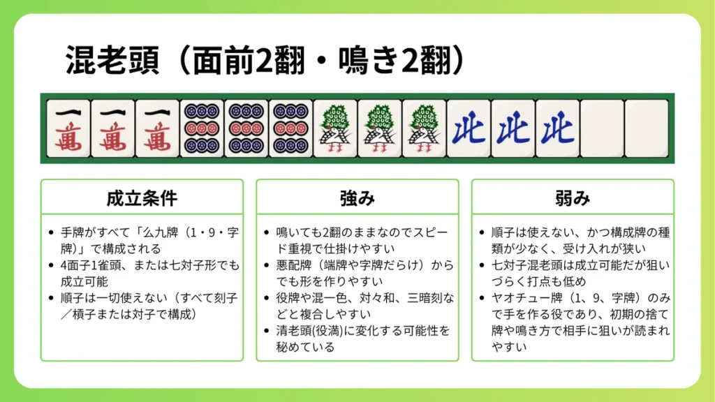 鳴いても2翻のままという点が特徴であり、仕掛けやすさと得点の安定性が両立しています。また、混老頭は清老頭や字一色といった上位役への手変わりも視野に入るため、打点上昇の余地が残されている点もポイントです。
