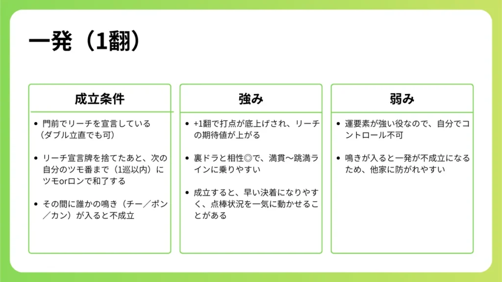 • 一発の役としての位置づけ(翻数・偶然役・リーチとの関係)