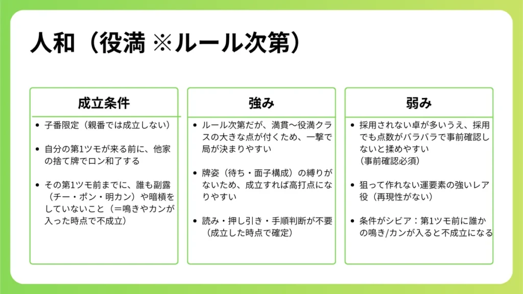人和はかなりルール差がある役だから、採用有無・点数・複合可否・細かい条件の4点は対局前に確認するのがよいよ!